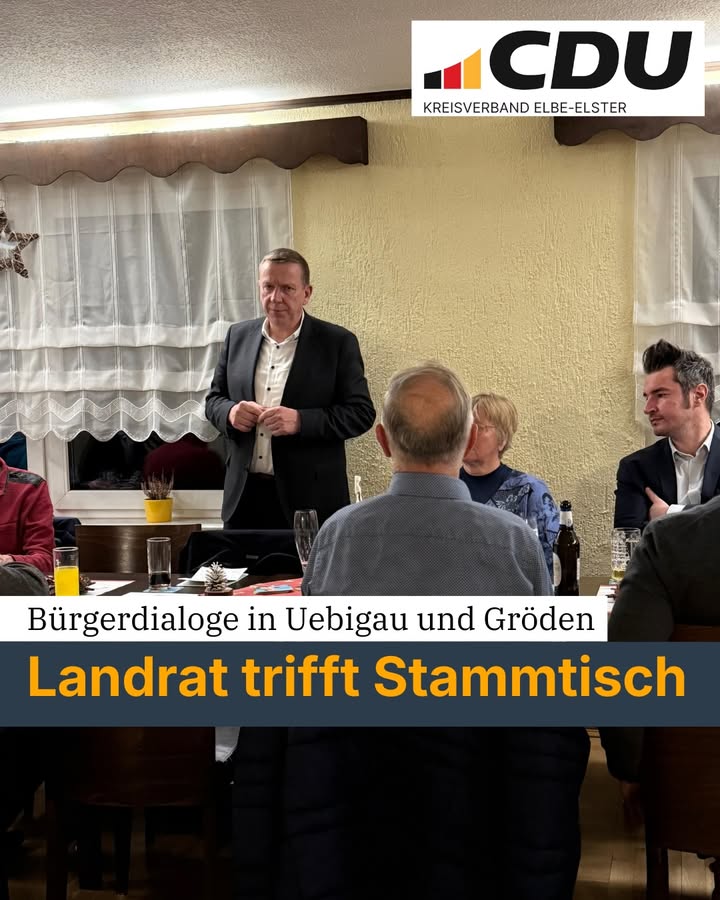 Bürgerdialoge "Landrat trifft Stammtisch" in Uebigau und GrödenZwei gut besuchte Abende liegen hinter uns. In Uebigau und Gröden hatten wir die Gelegenheit, direkt mit den Bürgerinnen und Bürgern ins Gespräch zu kommen. Uns ist wichtig zu erfahren, was die Menschen im Landkreis Elbe-Elster zufrieden macht ? und wo es noch Handlungsbedarf gibt.Besonders die Themen Bildung, Gesundheit und Infrastruktur sorgten für offene, konstruktive und sachliche Gespräche. Der direkte Austausch vor Ort ist für uns ein wichtiger Impulsgeber für unsere Arbeit.Auch im kommenden Jahr setzen wir das Format fort und werden alle Regionen des Landkreises besuchen.Kommen Sie gern vorbei, bringen Sie Ihre Anliegen ein und stellen Sie Ihre Fragen.