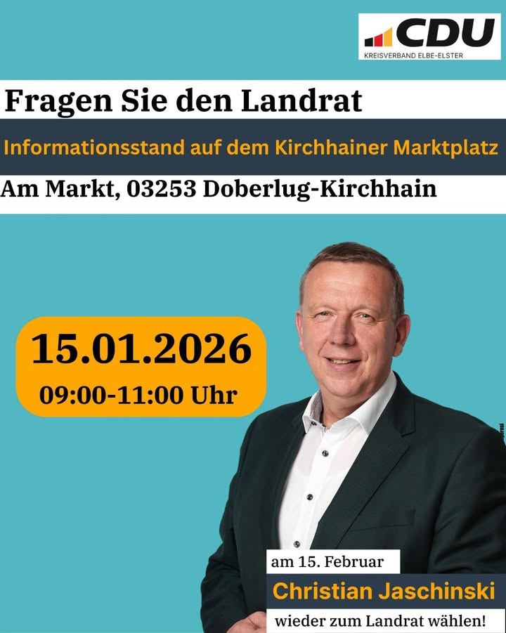 mehrLiebe Bürgerinnen und Bürger,ein neues Jahr liegt vor uns ? ich wünsche Ihnen und Ihren Familien dafür Gesundheit, Zuversicht und alles Gute.Am 15. Februar entscheiden Sie erneut darüber, wer unseren Landkreis Elbe-Elster führen soll. Diese Entscheidung ist wichtig ? und sie verdient den persönlichen Austausch. Deshalb lade ich Sie herzlich ein, mich kennenzulernen und mit mir über die Zukunft unseres Landkreises ins Gespräch zu kommen.Alle Termine sowie Informationen zu meinen Zielen finden Sie auf meiner Webseite:👉 www.landrat-jaschinski.deIch freue mich auf viele Begegnungen, gute Gespräche und Ihre Fragen.